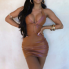 Αναδείξτε τις καμπύλες σας φορώντας αυτό το καφέ δερμάτινο φόρεμα με κορσέ. Το χαμηλό ντεκολτέ του θα σας χαρίσει ένα ωραίο ντεκολτέ που διατηρείται ιδανικά με τιράντες. Μας αρέσει ιδιαίτερα το κόψιμο στο μπροστινό μέρος που ενισχύει την αισθητική του. Ολοκληρώστε την εμφάνισή σας με χρυσά βραχιόλια και σκουλαρίκια.