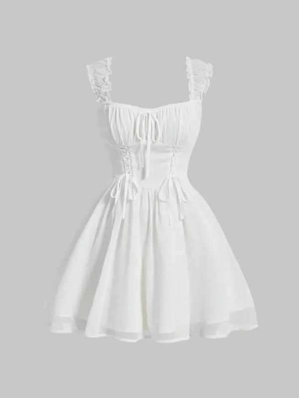 Σχηματισμένο κοντό φόρεμα κορσέ αγροικίας με μαζεμένο μπούστο και μονόχρωμη δαντέλα με βολάν από δαντέλα